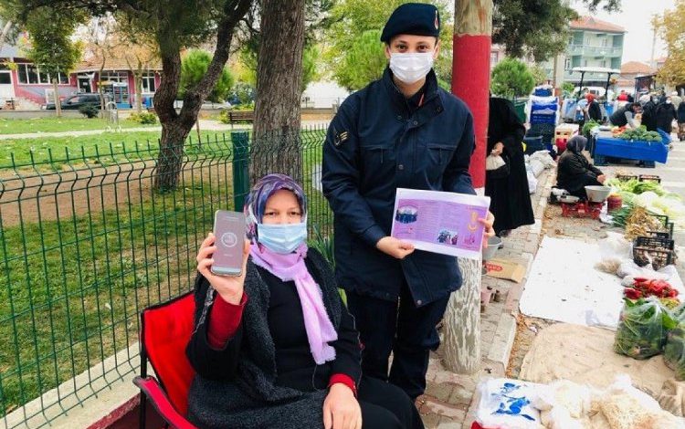 BALIKESİR (İGFA) – Balıkesir İl Jandarma Komutanlığı ekipleri “Kadın Acil Destek (KADES)” Uygulamasının tanıtımı ve farkındalığının artırılmasına yönelik olarak; Altıeylül ilçesi Atköy semt pazarında bulunan kadın vatandaşlara; akıllı telefon kullanıcısı kadınların IOS ve Android marketlerden indirebileceği programları uygulamalı gösterdi.